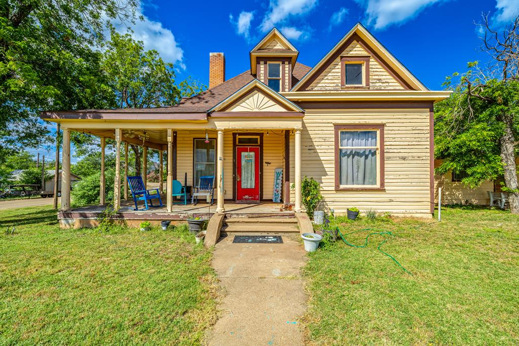Discover this spacious 2,915 sq. ft. 2-story home, featuring a large wrap-around front porch perfect for relaxing. Inside, a cozy fireplace welcomes you in the entrance. The living room has high ceilings and a gas fireplace; while the dining room offers access to the primary bedroom upstairs with a bathroom, but the bathroom is not fully operational and needs to be completed. The open kitchen overlooks the backyard, which features large trees providing shade and a garden bed. The home requires some TLC, but has incredible potential. Barn/shop, which also needs updating, is 11x24 with electricity and a 11x6.6 hinged door facing the side street.