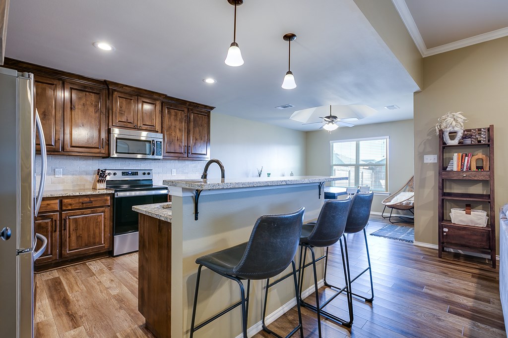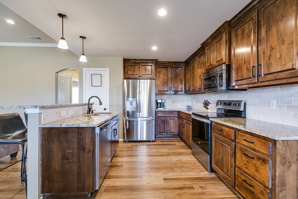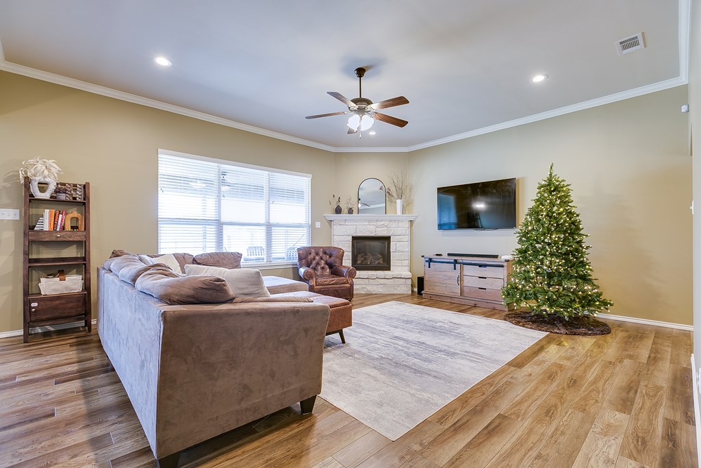 Welcome to this stunning 3-bedroom, 2-bathroom home in the desirable Preston Wood subdivision, conveniently located near schools, shopping, and dining. Upon entering, you'll be greeted by beautiful floors and a striking stone fireplace that creates a cozy, inviting atmosphere. The spacious kitchen features granite countertops, custom cabinetry, panty, and stainless steel appliances ideal for both cooking and entertaining. The split-bedroom layout offers privacy, with a primary suite that includes a walk-in shower, soaker tub, double vanity, and large closet. Outdoors, enjoy a covered extended patio, privacy-fenced yard with a fire pit area, and a 2-car garage with alley access, plus an extended driveway for extra parking. With its generous space and fantastic features, this home is perfect for family gatherings—make it yours just in time for the holidays!