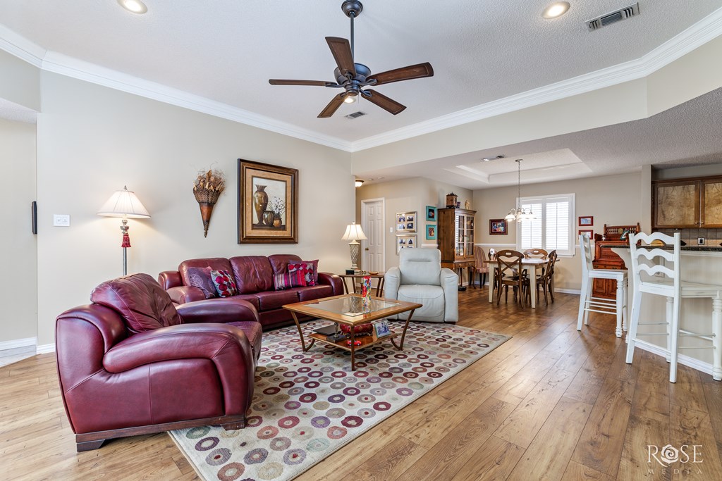 Charming 3-bedroom, 2-bath patio home in highly desirable area featuring an open-concept layout including a cozy gas log fireplace to enjoy after a long day of work. This home offers a split bedroom design, ensuring privacy for the spacious master suite. This home showcases luxury vinyl flooring, carpet and tile throughout. The kitchen is equipped with stainless steel appliances, a large walk-in pantry, and a generous workspace to prepare your favorite meals. You have the option of eating your meals in the dining area or at the bar. This home boasts elegance with plantation shutters and crown molding along with plenty of natural light. Enjoy the outdoors on the inviting patio, all complemented by beautiful landscaping in front and back. Other bonuses are an R/O system and water softener. This home is a must-see for those seeking both comfort and style.