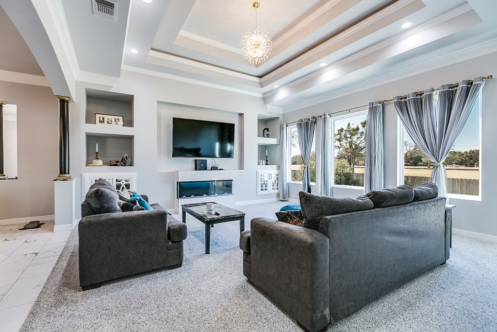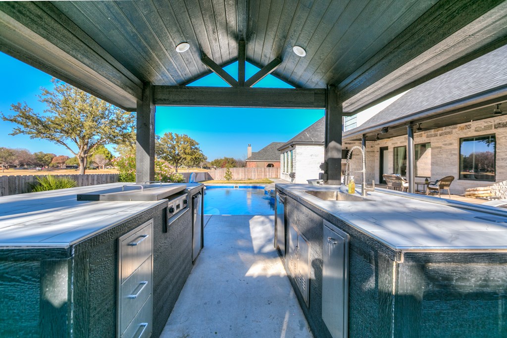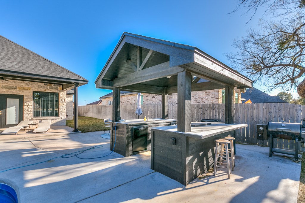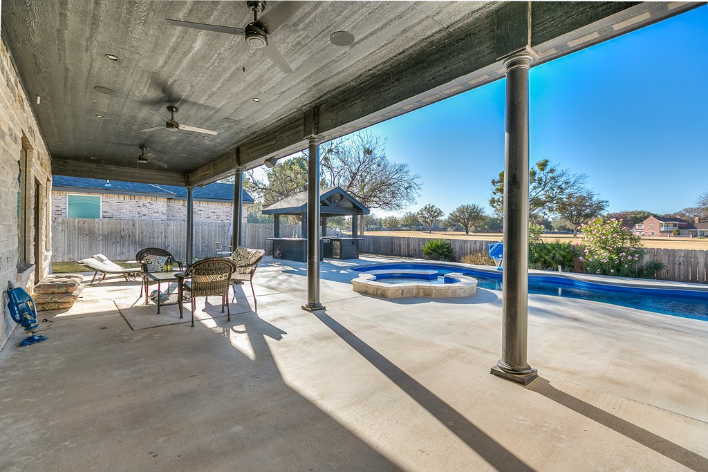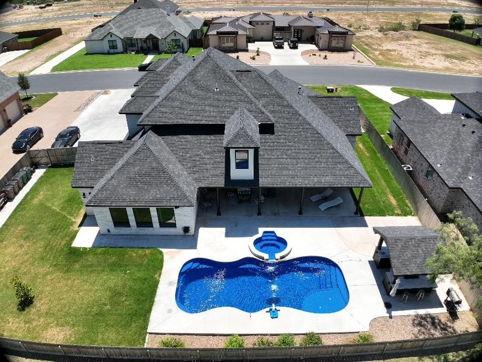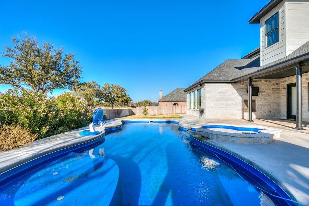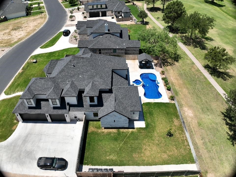 Nestled on the golf course of Bentwood Country Club Estates, this exquisite residence spans 4704 square feet and offers unparalleled luxury. Boasting 5 bedrooms and 4 full baths, the home is designed for both comfort and entertainment and features a spacious game room and a dedicated workout area, complemented by a state-of-the-art movie/theater room. The expansive kitchen centers around a massive island, perfect for culinary enthusiasts and gatherings alike. Relaxation awaits in the primary bedroom, complete with a cozy fireplace. Ample storage is provided with generously sized closets throughout, a surround sound system wired throughout the entire home, and a dedicated water purification system underscores the commitment to quality living. Backyard oasis beckons with a heated pool and inviting hot tub, surrounded by an outdoor kitchen and wired for surround sound. This remarkable property offers a lifestyle of luxury and comfort, meticulously designed with countless amenities.