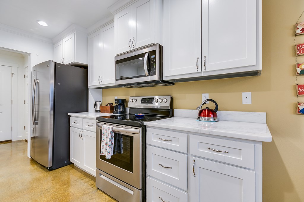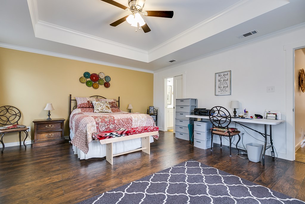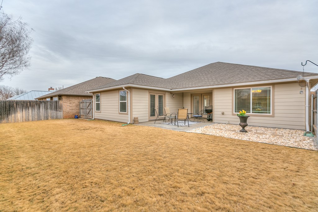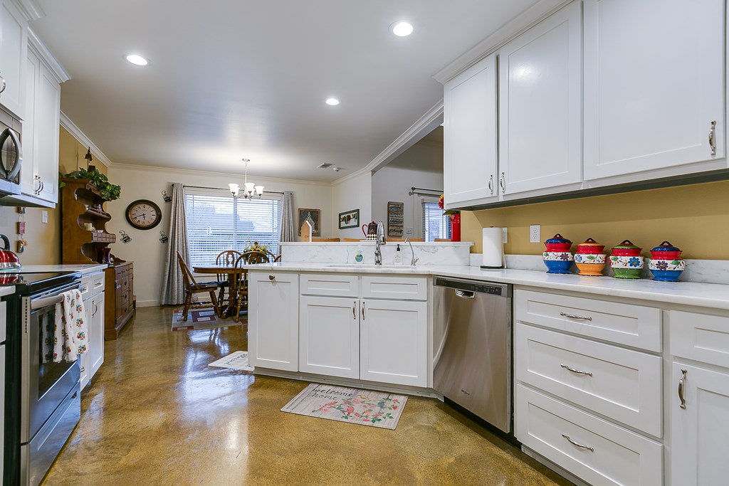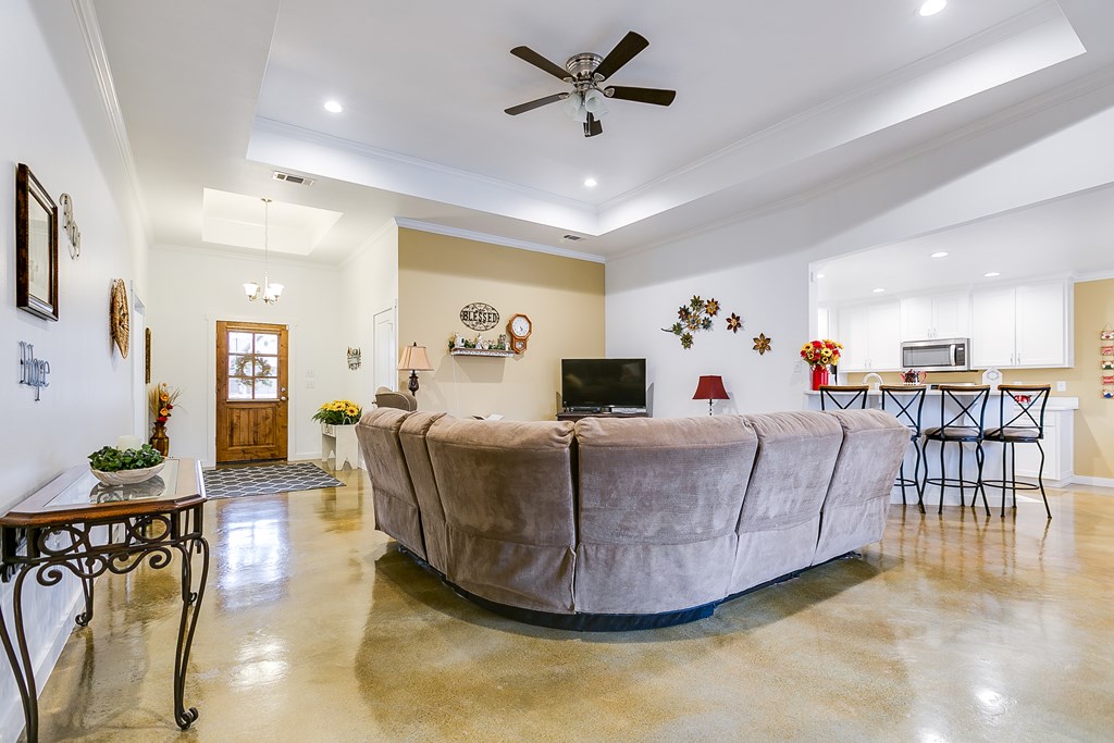 Discover this beautifully maintained 3-bedroom, 2-bathroom home, offering nearly 1,800 sq.ft. of thoughtfully designed living space in the desirable Bluffs addition. Built in 2018, this property boasts a recently replaced roof and meticulous care year after year, ensuring it's move-in ready. Step inside to find soaring ceilings and detailed crown molding that add a touch of elegance, while the polished stained concrete floors provide durability and style. The bedrooms feature newly installed wood laminate flooring, blending warmth and modern appeal. The heart of the home is the stunning kitchen, complete with sleek marble countertops and contemporary finishes, making it a perfect space for cooking and entertaining. This home truly offers the best of style, comfort and quality craftsmanship. Don't miss the opportunity to make it yours!