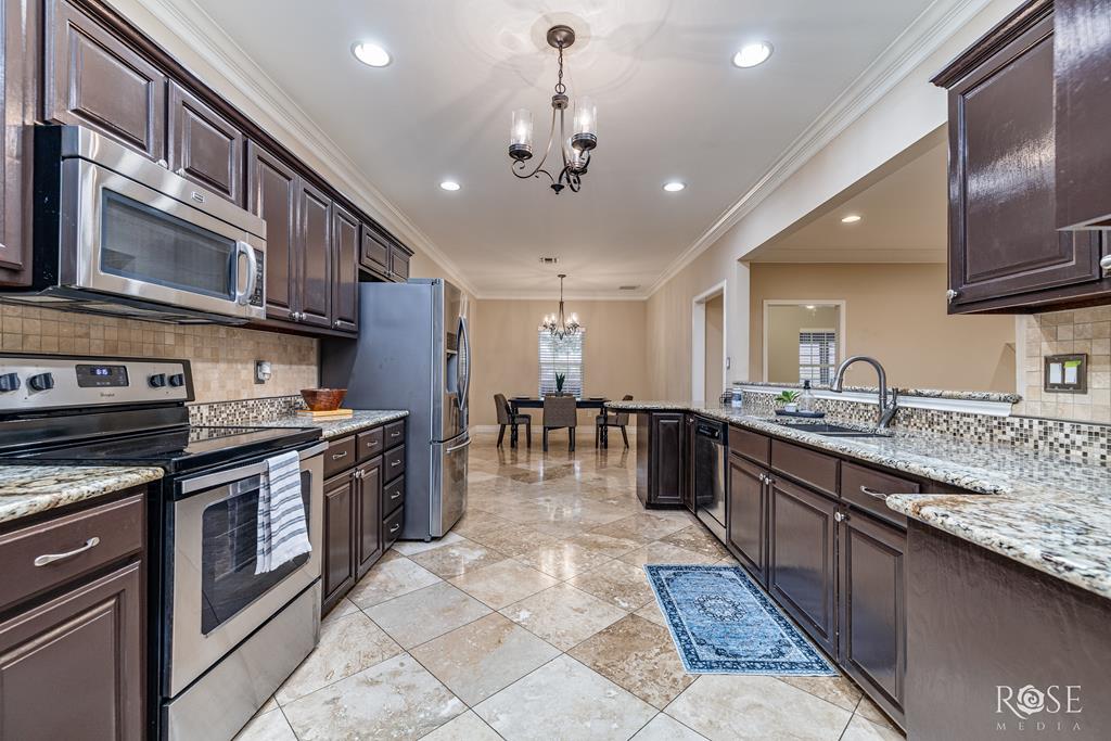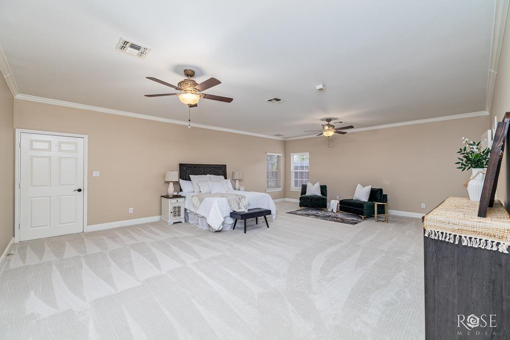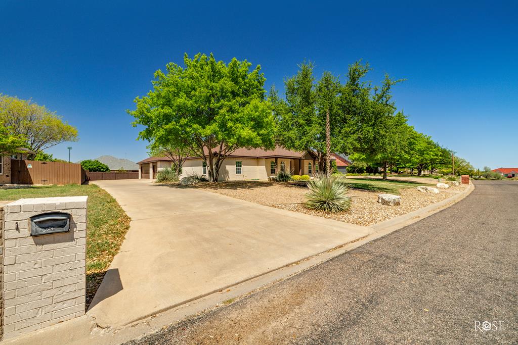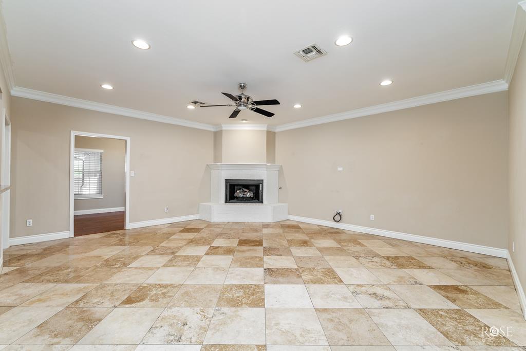 Modern elegance in The Bluffs! This property shows like a new house. The impressive 8' double-entry doors lead into a foyer with beautiful, custom wood bookshelves the length of the entry. Soaring 9' ceilings throughout. The den/family room has gorgeous travertine floors with a fireplace that makes the room feel cozy. At 27 x 20' the primary bedroom is large enough for a sitting area & the primary bathroom is luxurious featuring a 5' claw foot tub, large walk-in shower, his and her sinks and 2 large walk-in closets. Continue to be amazed at the size of the two front guest bedrooms that are 18 x 14' with walk-in closets. The third guest bedroom is near the primary bedroom and can serve as a bedroom, nursery, craft room, bonus room, or study. A tiled study/den/sun room at the back of the house leads to the 23' x 17' enclosed, tiled patio with ceiling fan. The hot tub is a few steps from the patio. 2.5 car (2 cars & 1 golf cart) garage. All this house needs is a new owner to love it!