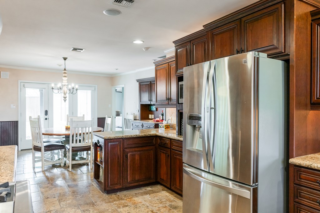 This stunning home is that rare, coveted Santa Rita jewel that doesn't come along very often! Elegant, sprawling ranch style home w/ two living areas & two dining areas- perfect for large family gatherings & holiday celebrations! The oversized kitchen is awesome w/ Wolf gas range, refrigerator, microwave & the washer/dryer will also convey. This fabulous home has been meticulously maintained & has so many extra amenities! There are remote control blinds in kitchen area, water softener, RO system at kitchen sink & also a second RO that is plumbed for a separate icemaker. All three bedrooms are very large w/ ensuite bathrooms- each could be considered a master suite. The beautiful, fenced pool will be enjoyed by all and is ready to go w/ a new liner, new pool cover and new WIFI enabled pump- all upgraded in 2024. Roof replaced in 2020 and AC replaced in 2020. There is unbelievable storage throughout this amazing home & a large outside storage building too! Don't miss this one!