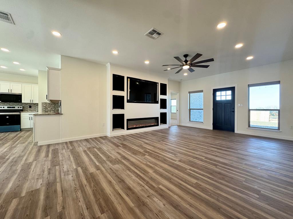 Modern New Build – This sleek 4-bedroom, 2-bathroom features an open floor plan filled with natural light and a modern kitchen in a prime location near restaurants, shopping and more! The custom-built entertainment center with a high-end electric fireplace adds style and warmth to the open living space. The spacious backyard has been landscaped with new grass, offers stunning views of the San Angelo skyline—perfect for relaxing or entertaining. Start making memories in this stylish, nearly finished home! Contact us today to learn more.