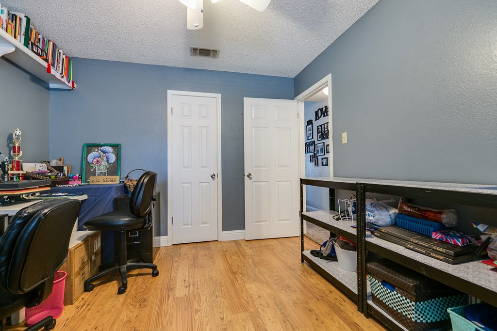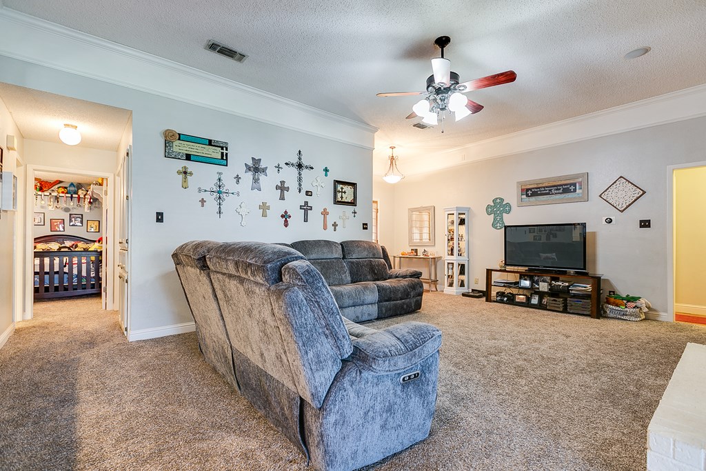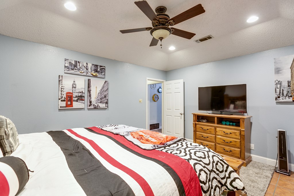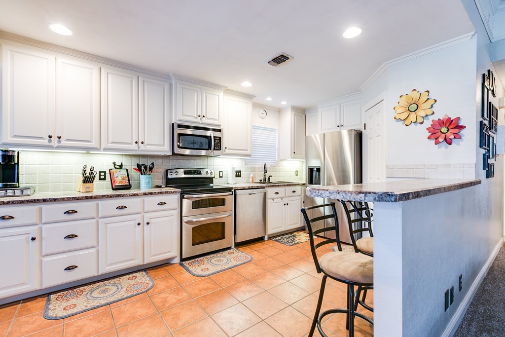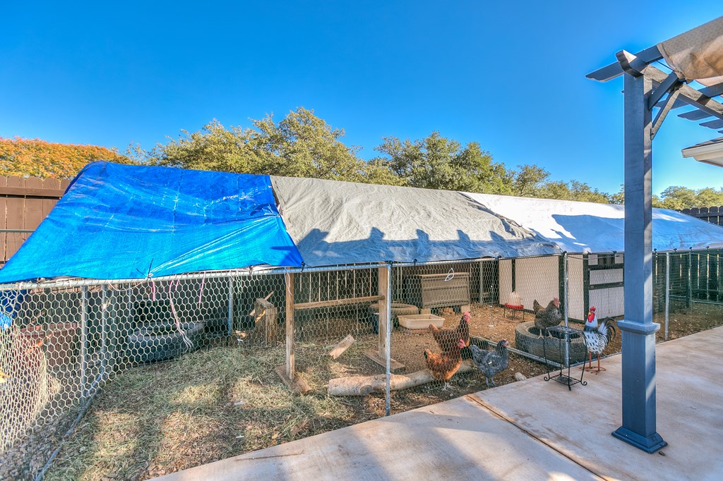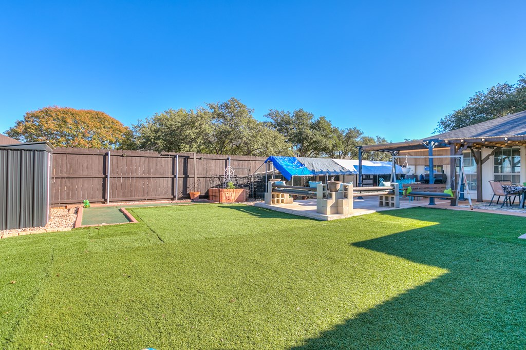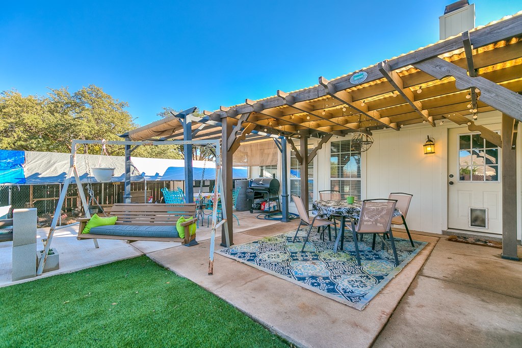 Open floor plan with designated spaces, great cabinets, new roof, new water heater, new garage door opening, new disposal, new piping in master shower, quartz countertops in bathrooms, Spanish tile under carpet in living room, high ceilings, and split floor plan. Outside enjoy pet friendly turf, extended patio covered by a pergola and a beautiful corner lot just a minute from Bonham elementary, dining and shopping.