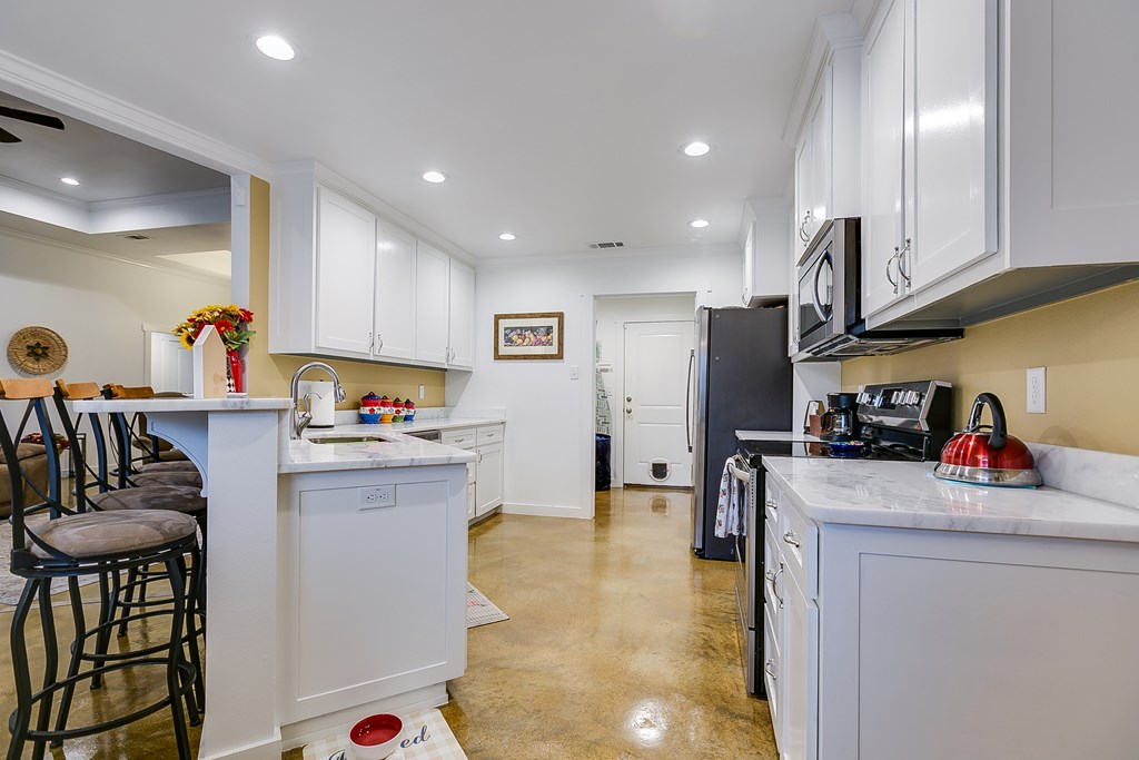 Discover this beautifully maintained 3-bedroom, 2-bathroom home, offering nearly 1,800 sq.ft. of thoughtfully designed living space in the desirable Bluffs addition. Built in 2018, this property boasts a recently replaced roof and meticulous care year after year, ensuring it's move-in ready. Step inside to find soaring ceilings and detailed crown molding that add a touch of elegance, while the polished stained concrete floors provide durability and style. The bedrooms feature newly installed wood laminate flooring, blending warmth and modern appeal. The heart of the home is the stunning kitchen, complete with sleek marble countertops and contemporary finishes, making it a perfect space for cooking and entertaining. This home truly offers the best of style, comfort and quality craftsmanship. Don't miss the opportunity to make it yours!