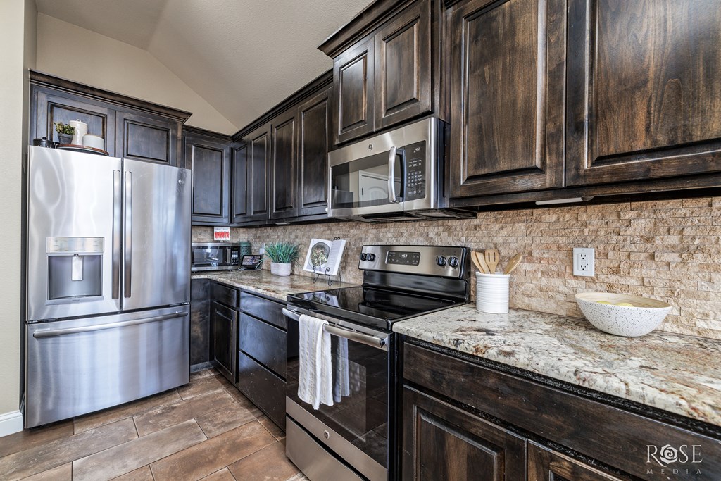 Welcome to this stunning 4-bedroom, 2-bathroom home in the highly desirable Trinity West community! Step inside to an inviting open-concept living area featuring tall ceilings, large windows that fill the space with natural light, and a cozy wood-burning fireplace—perfect for relaxing or entertaining. The spacious kitchen seamlessly flows from the living room, offering an abundance of cabinetry, sleek granite countertops, and a convenient island for meal prep and gathering. The split bedroom layout ensures privacy, with the primary suite thoughtfully separated from the additional bedrooms. The ensuite bathroom is a true retreat, featuring both a tub and a shower, along with a dual vanity for added convenience. Outside, enjoy a fully fenced backyard with a tall privacy fence and a covered patio, providing an ideal setting for outdoor enjoyment. This home combines comfort, style, and an unbeatable location!