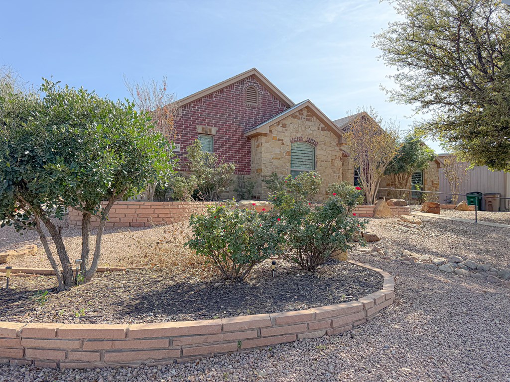 Nestled in the picturesque Bluffs neighborhood, this stunning brick home sits on a desirable corner lot, offering both curb appeal and privacy. Boasting classic charm with modern updates, this home features 3 bedrooms, 2 bathrooms, a spacious layout, and abundant natural light throughout. Step inside to find a warm and inviting living space with laminate floors, a cozy fireplace and your own personal office. The kitchen is beautifully appointed with granite countertops, stainless steel appliances and custom cabinetry-perfect for both everyday meals and entertaining. Outside, the zeroscaped front yard exudes maintenance free beauty. While the well-manicured backyard and covered patio provide the perfect setting for relaxation or gatherings. This home offers a serene retreat while being just minutes from shopping, dining, and many other amenities. Don't miss this rare opportunity to own a timeless home in The Bluffs!