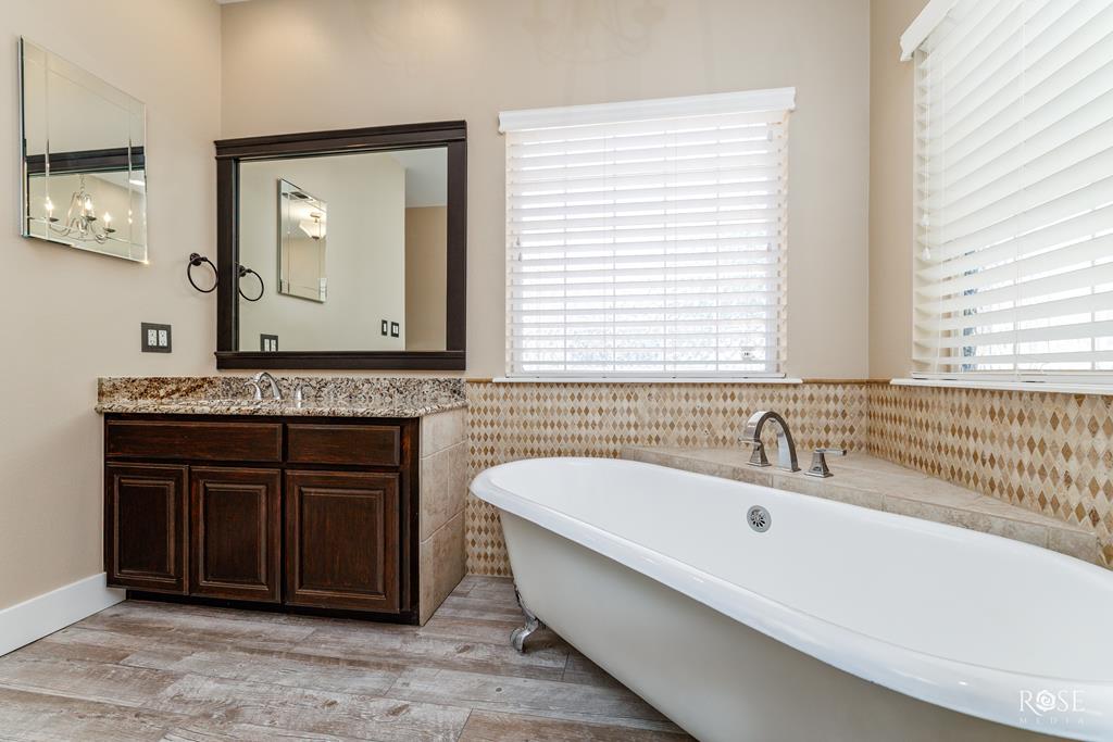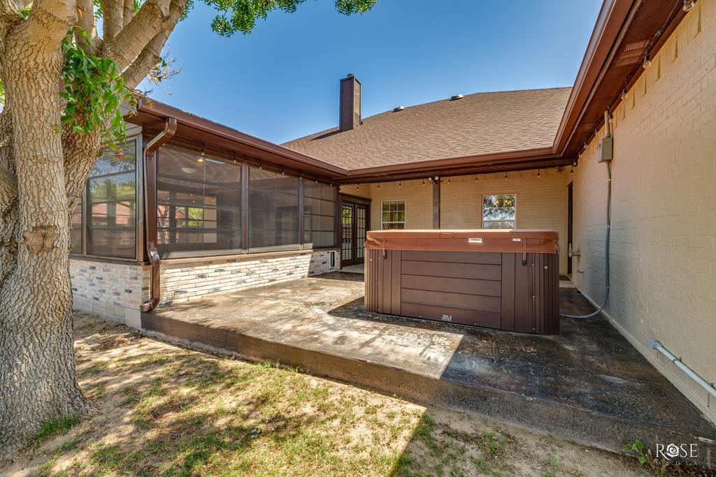 Modern elegance in The Bluffs! This property shows like a new house. The impressive 8' double-entry doors lead into a foyer with beautiful, custom wood bookshelves the length of the entry. Soaring 9' ceilings throughout. The den/family room has gorgeous travertine floors with a fireplace that makes the room feel cozy. At 27 x 20' the primary bedroom is large enough for a sitting area & the primary bathroom is luxurious featuring a 5' claw foot tub, large walk-in shower, his and her sinks and 2 large walk-in closets. Continue to be amazed at the size of the two front guest bedrooms that are 18 x 14' with walk-in closets. The third guest bedroom is near the primary bedroom and can serve as a bedroom, nursery, craft room, bonus room, or study. A tiled study/den/sun room at the back of the house leads to the 23' x 17' enclosed, tiled patio with ceiling fan. The hot tub is a few steps from the patio. 2.5 car (2 cars & 1 golf cart) garage. All this house needs is a new owner to love it!